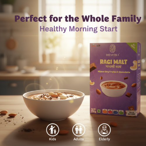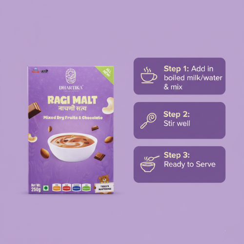 DhartiKa Ragi Malt is highly sensitive to moisture and should be in a clean, dry and hygienic condition. After opening the pack the DhartiKa Ragi Malt should immediately be placed in an air tight container.